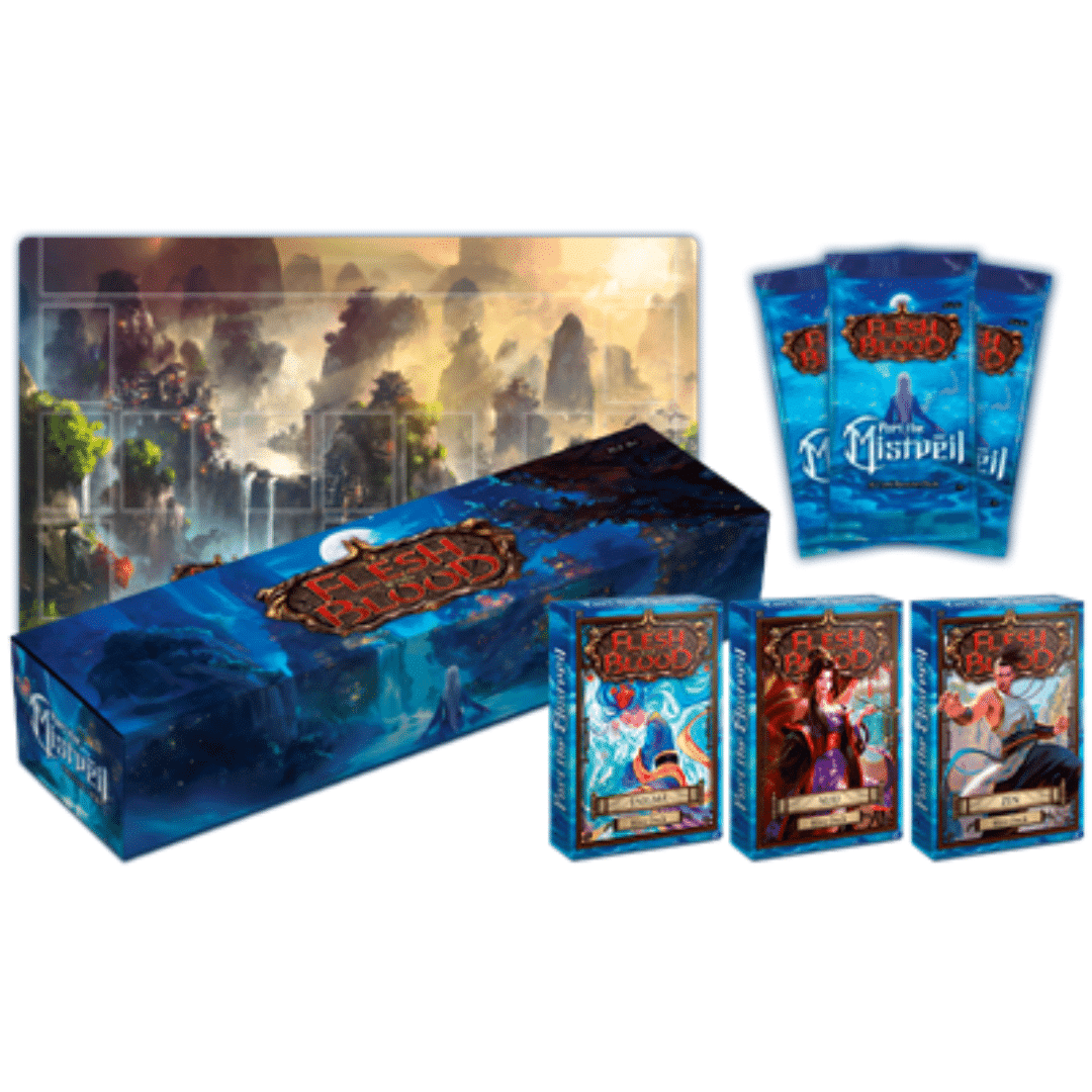 Including 3 Part the Mistveil Blitz Decks (Enigma, Nuu, Zen), 3 Part the Mistveil booster packs that can be used to customize each of the decks, and a beautiful Misteria «»Hanging Village»» rubber playmat with zones, all packaged inside a reusable 1000ct Mistcloak Gully storage box.