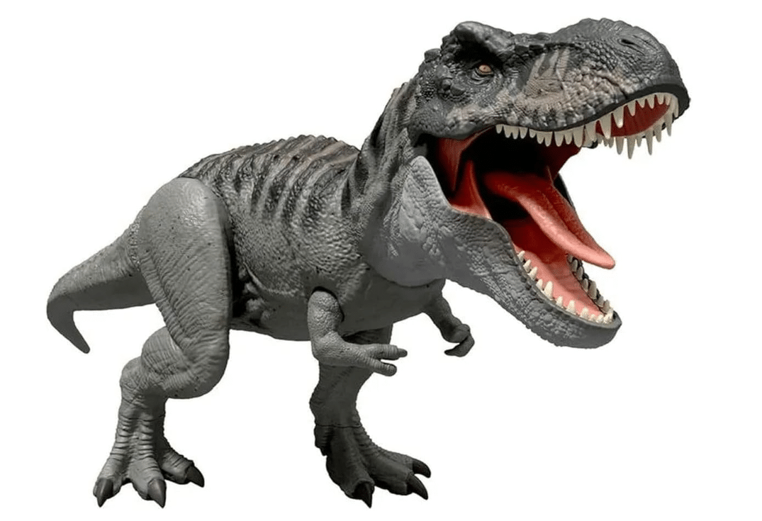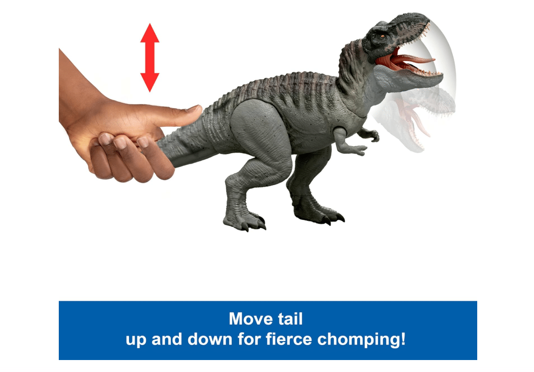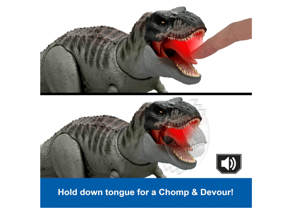 ¡Este tiranosaurio rex de la línea Power Devour inspirado en la película Jurassic World: Rebirth tiene una bestial función que le permite morder una y otra vez! Cuando se presiona la lengua hacia abajo, se escucha un rugido de victoria inicial. Cuando se mantiene la lengua pulsada durante más tiempo, se activa un feroz frenesí de mordiscos con luces y sonidos. ¡Esta función permite disfrutar de un juego de batalla lleno de acción mientras el T-Rex Rebirth muerde otras figuras de dinosaurios! Al manipular la cola, la cabeza se mueve hacia arriba y hacia abajo o de lado a lado con la enorme mandíbula abierta.