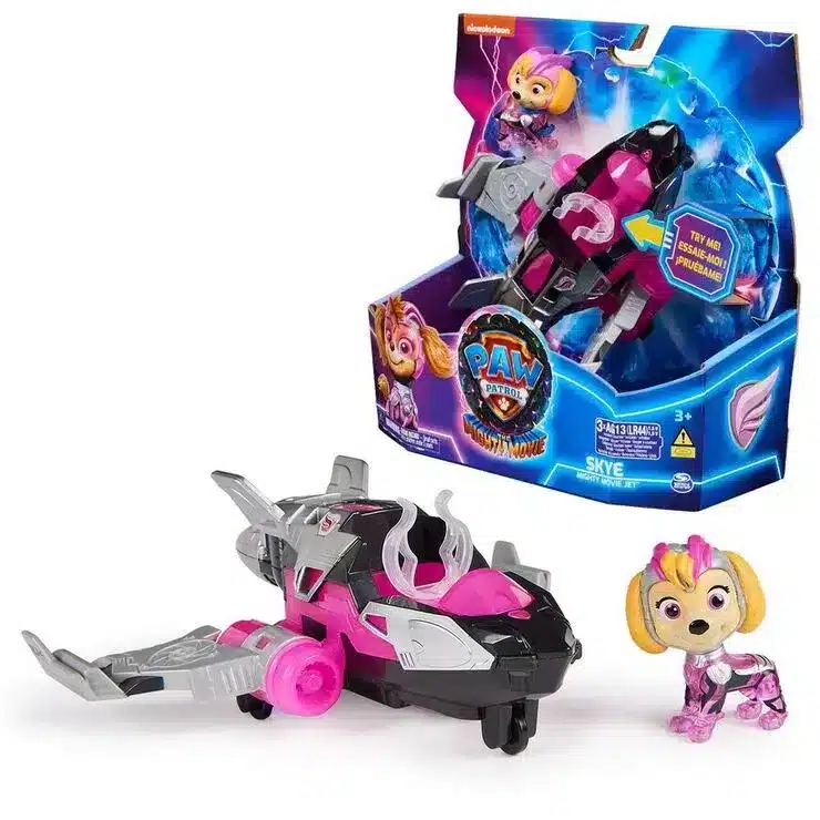 PATRULLA CANINA LA SUPERPELÍCULA FIGURAS: Vestido con su uniforme de la Patrulla Canina: la Superpelícula, esta figura de juguete inimitable de Skye es un juguete imprescindible, con partes translúcidas que se iluminan cuando está en su vehículo