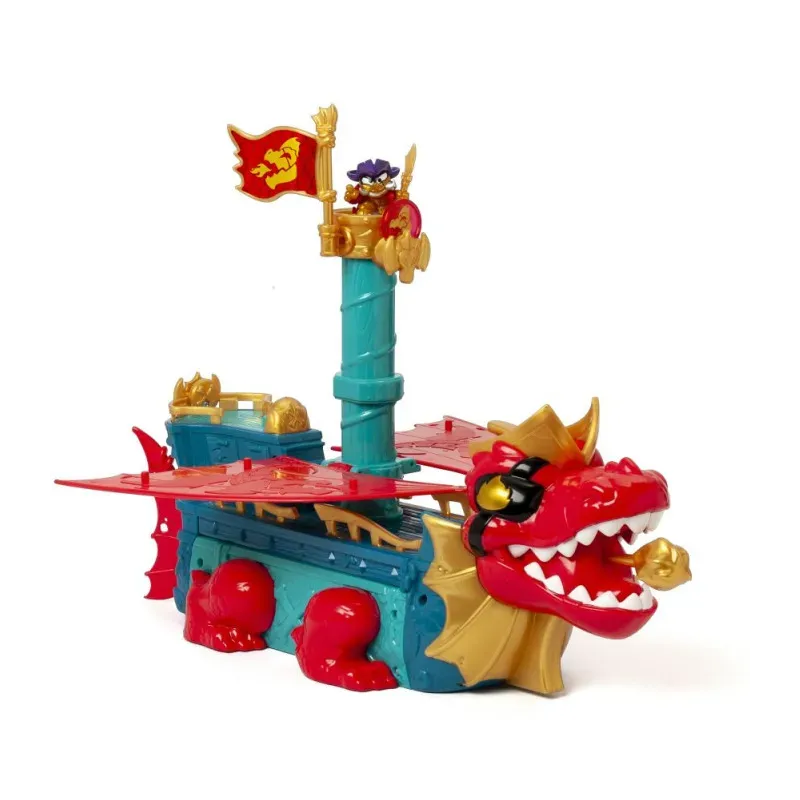 Dragon Ship puede surcar los Siete Mares gracias a su casco aerodinámico y su fuerte timón en la cola: muévelo para dirigirlo por el agua en busca de nuevas aventuras. ¿Tierra a la vista? Utiliza la moneda exclusiva para transformarlo en dragón y así desplazarte por la playa o la jungla. Y en cuanto te hayas hecho con el tesoro ¡despliega sus alas y a volar! Recuerda que, ante cualquier peligro, puedes disparar el proyectil en forma de fuego con el cañón escondido entre sus mandíbulas. Pon tus Piratix por todo el Dragon Ship ¡y lidéralos hacia nuevas aventuras y tesoros!