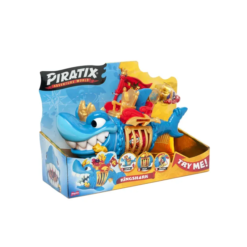 El rey de las aguas de Shark Island es el tiburón King Shark ¡y ahora tú eres el que lo controla! Junto al Capitán Hermitt capturarás de un solo bocado a todos aquellos que se atrevan a entrar en tus dominios. Utiliza el poder de King Shark, cuyo origen está en el Tesoro del Rey Tiburón que se tragó por accidente, para navegar por las profundas y traicioneras aguas de la isla. Solo con el tesoro exclusivo podrás liberar a los incautos que hayan caído en sus fauces. Si quieres claro. ¡Que el espíritu Piratix te guíe!