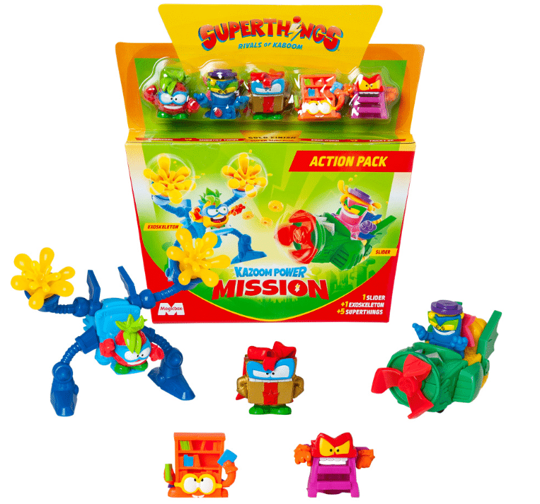 ¡Únete a la búsqueda del Kazoom con los SuperThings! Con los nuevos episodios de la serie de TV de Clan «SuperThings Kazoom Power Mission» llegan +80 figuras para coleccionar junto con la nueva versión del ultrararo Profesor K. Este nuevo Action Pack incluye uno de los superlíderes dorados, 4 figuras ¡y 1 slider y 1 exoskeleton, un héroe y un villano, para sumarte a la batalla en Kaboom City! Descubre sus habilidades… ¡y al ataque!