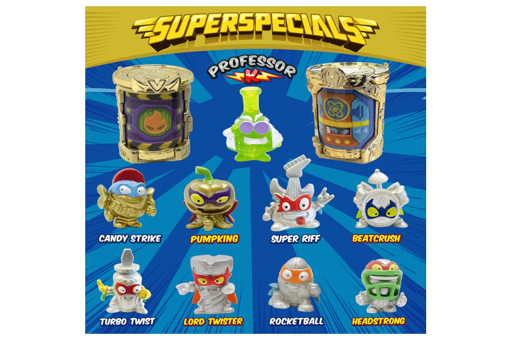 Consigue a los 9 SuperThings exclusivos de la serie 2. Professor K (ultrararo), Candy Strike y Pumpking (dorados), y los plateados Headstrong, Rocketball, Beatcrush, Super Riff, Lord Twister y Turbo Twist.