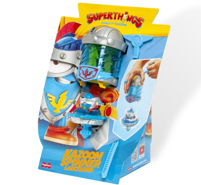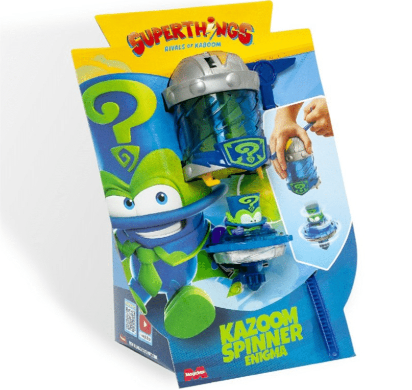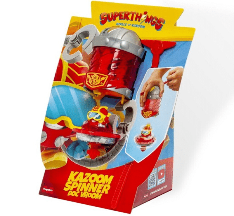 Surtido de 6 Kazoom Spinners. Inserta la tira en la ranura, estírala con fuerza hasta sacarla del todo y lanza tu peonza. Incluye un Kazoom Spinner y una tira.