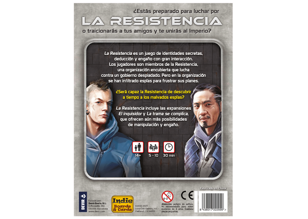 La Resistencia es un juego de identidades secretas, deducción y engaño con una gran dosis de interacción. Los jugadores son miembros de la Resistencia, una organización encubierta que lucha contra un gobierno despiadado. Pero en la organización se han infiltrado espías para frustrar sus planes. ¿Será capaz la Resistencia de descubrir a tiempo a los malvados espías? La Resistencia incluye las expansiones El inquisidor y La trama se complica, que ofrecen aún más posibilidades de manipulación y engaño.