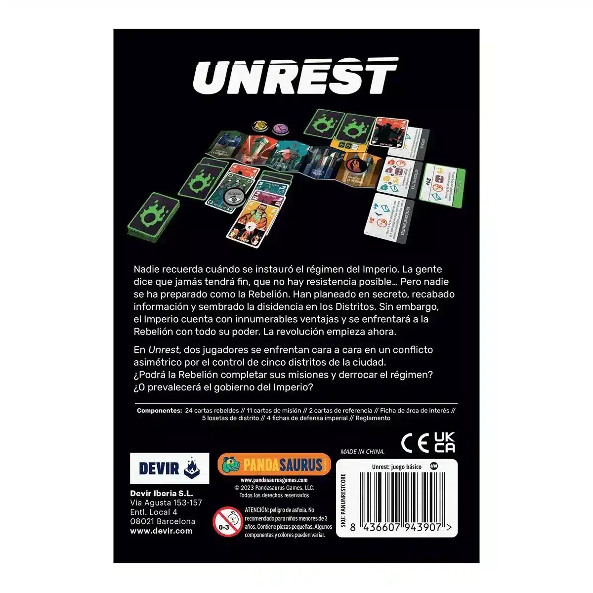 Nadie recuerda cuándo se instauró el régimen del Imperio. La gente dice que no acabará nunca, que no hay resistencia posible… Pero nadie se ha preparado como la Rebelión. Han planeado en secreto, recabado información y sembrado la disidencia en los distritos. Sin embargo, el Imperio cuenta con innumerables ventajas y se enfrentará a la Rebelión con todo su poder. La revolución empieza ahora. Diseñado por Brendan Hansen e ilustrado por Jor Ros, Unrest permite partidas a dos jugadores, a partir de 10 años, de unos 15 minutos de duración. A lo largo de la partida, ambos jugadores se enfrentarán cara a cara en un conflicto asimétrico por el control de cinco distritos de la ciudad. Aprender a jugar a Unrest es sencillo, pero saber tomar las mejores decisiones en cada momento será todo un reto. En su turno, el jugador rebelde debe decidir en qué distritos adyacentes centrará su atención. A continuación jugará tres cartas, dos ocultas y una revelada, para tratar de influir en esos distritos, de acuerdo con las cartas de misión que hayan aparecido durante la preparación. Por su parte, el jugador imperial dispone de 4 fichas de poder, de las cuales usará 2 en cada turno, que le permiten revelar cartas ocultas, destruir cartas, moverlas o bloquear un distrito. El mazo de cartas del jugador rebelde contiene cartas de valores de 2 a 6 de cuatro palos diferentes (Inteligencia, altercado, desorden y suministros), así como cuatro cartas de distracción. Las distintas misiones requerirán que haya una cierta suma de valores de un tipo concreto de carta para liberar los distritos. Las cartas de distracción, por su parte, solo sirven para distraer al Imperio. Si los rebeldes consiguen apilar cartas que completen misiones en 3 o más distritos, se alzarán con la victoria y el Imperio será derrocado. Si el Imperio lo evita, manteniendo el control de 3 o más distritos hasta el final de la partida, el gobierno del Imperio prevalece y la victoria es suya. ¿Podrá la Rebelión completar sus misiones y derrocar el régimen? ¿O prevalecerá el gobierno del Imperio?