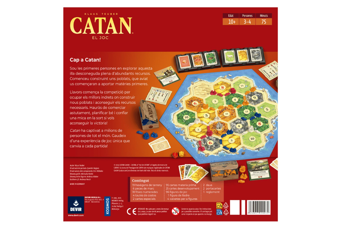 Un joc de taula d’estratègia i diplomàcia creat per Klaus Teuber. Des de la seva aparició, l’any 1995, és un dels jocs més venuts i més premiats arreu del món, a més del precursor d’un nou gènere de jocs de taula que té milions de seguidors. Catan és una illa imaginària plena de matèries primeres. L’objectiu del joc és conquerir i colonitzar l’illa de Catan, formada per 19 hexàgons de terreny envoltats pel mar. Cada jugador comença la partida amb dos poblats i dues carreteres. A mesura que expandeixen els seus dominis, els jugadors han de construir més poblats i convertir-los en ciutats. Però, per construir, abans cal comerciar amb matèries primeres… Aprofiteu les oportunitats de negociar i comerciar, però Catan només pot tenir un únic sobirà. Cada partida és completament diferent de l’anterior, ja que el tauler de joc es crea de bell nou cada vegada.