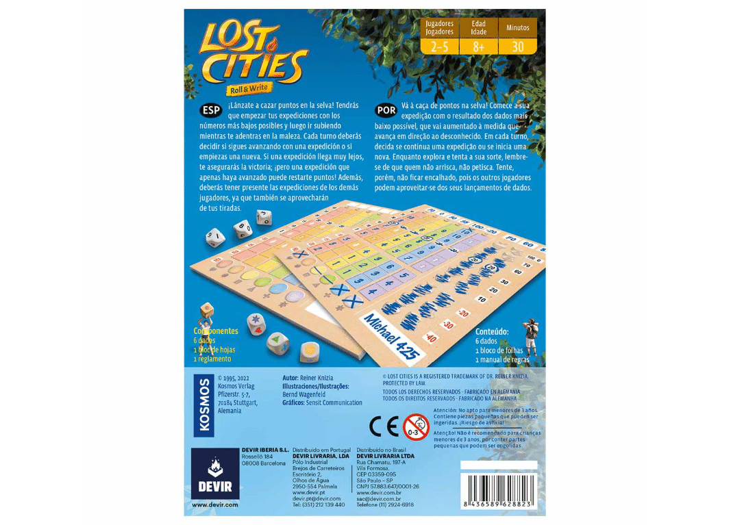 ¡Aventureros, nos vamos de expedición! Esta versión alternativa y totalmente independiente del clásico Lost Cities no usa cartas, sino dados y hojas para ir anotando los resultados que más nos interesen. Competirás en un grupo de hasta 5 jugadores para ganar puntos explorando las 6 expediciones distintas y recuperando valiosos artefactos del pasado.