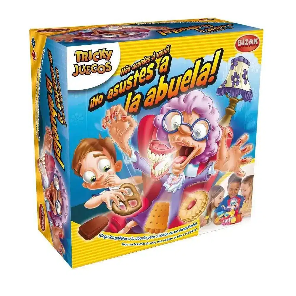 ¡Coge la galleta pero sin asustar a la abuela! A la abuela le encantan las galletas y ¡¡las quiere todas solo para ella!! Cuando la abuela duerme ¡es el momento de atacar! Espera tu turno y coge las galletas … shhh, ¡ten cuidado de no asustarle! Contenido: 1 abuela en silla de ruedas, 1 ruleta 12 galletas