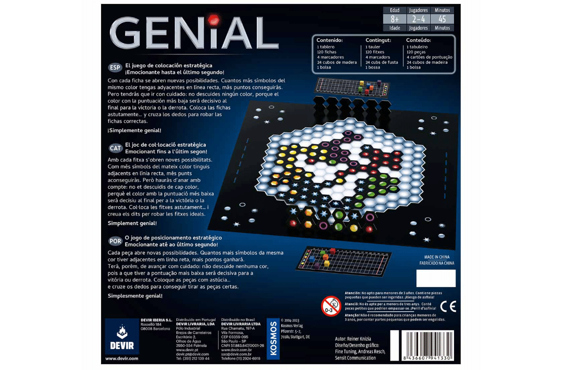 Vuelve un gran clásico para todos los públicos… ¡En un nuevo formato! Obra maestra del legendario Reiner Knizia, Genial es un juego ingenioso e imaginativo de estrategia que ha sido nominado a importantes premios y que no puede faltar en ninguna ludoteca. ¡Genialmente simple y simplemente genial!