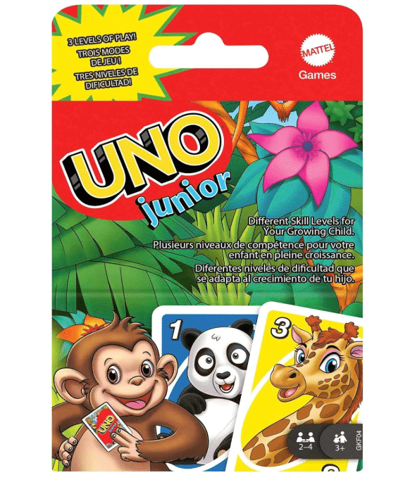 UNO Junior es el juego de cartas que gusta a todo el mundo. Se ha reinventado para los más pequeños, con múltiples niveles para que los niños puedan crecer con el juego. Cada nivel presenta nuevos desafíos. Las imágenes de animales de colores les encantarán a los niños y emparejarlas será mucho más fácil.