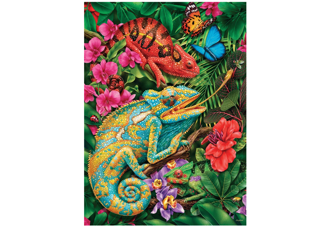 Con el rompecabezas Karma Chameleon de Cobble Hill, ¡la diversión está garantizada durante horas! Este colorido puzzle de 1000 piezas desafía a grandes y pequeños a descubrir la obra de arte pieza a pieza.