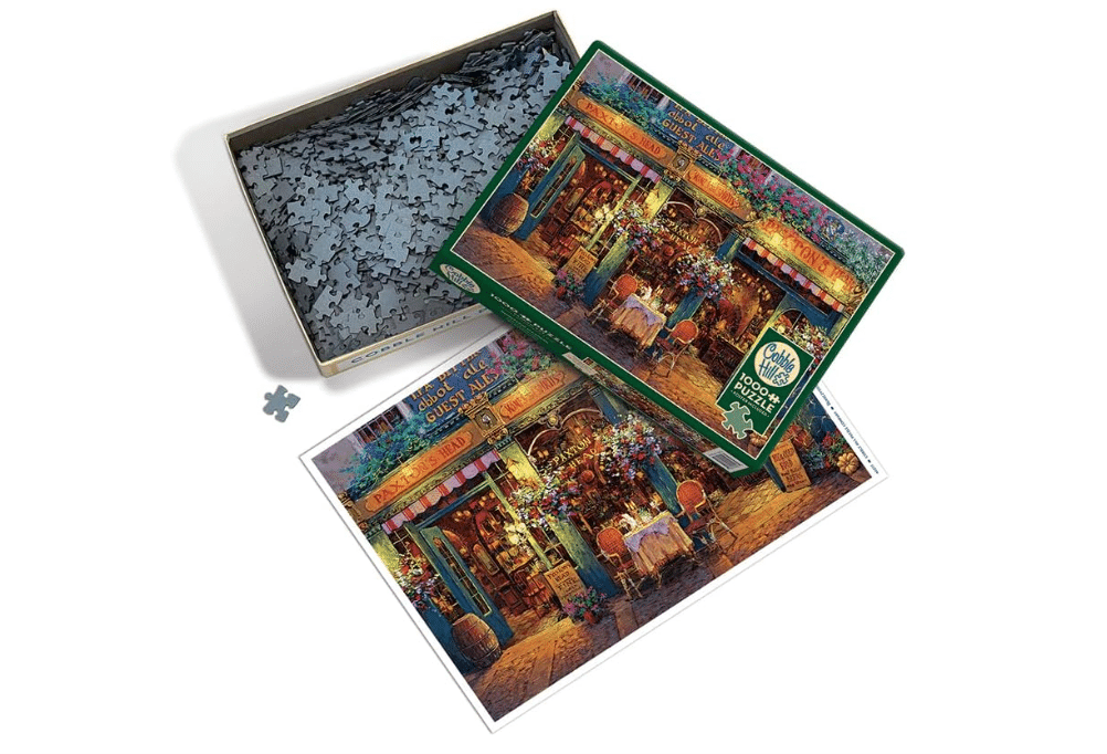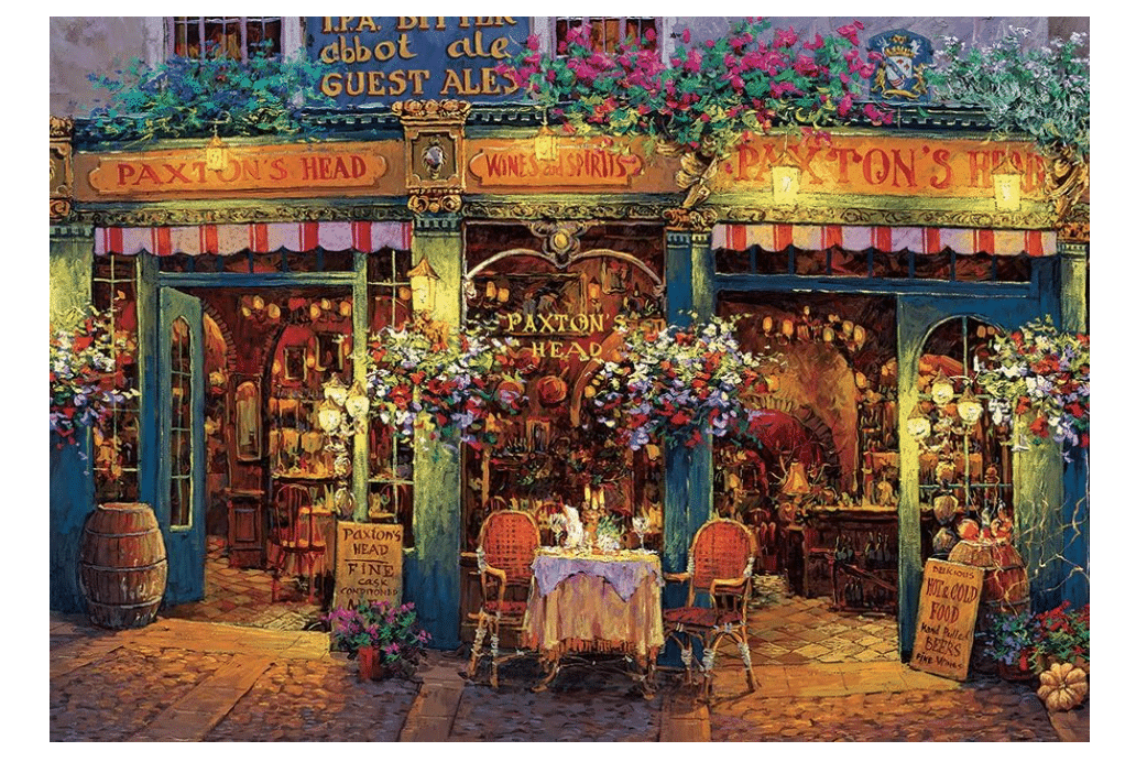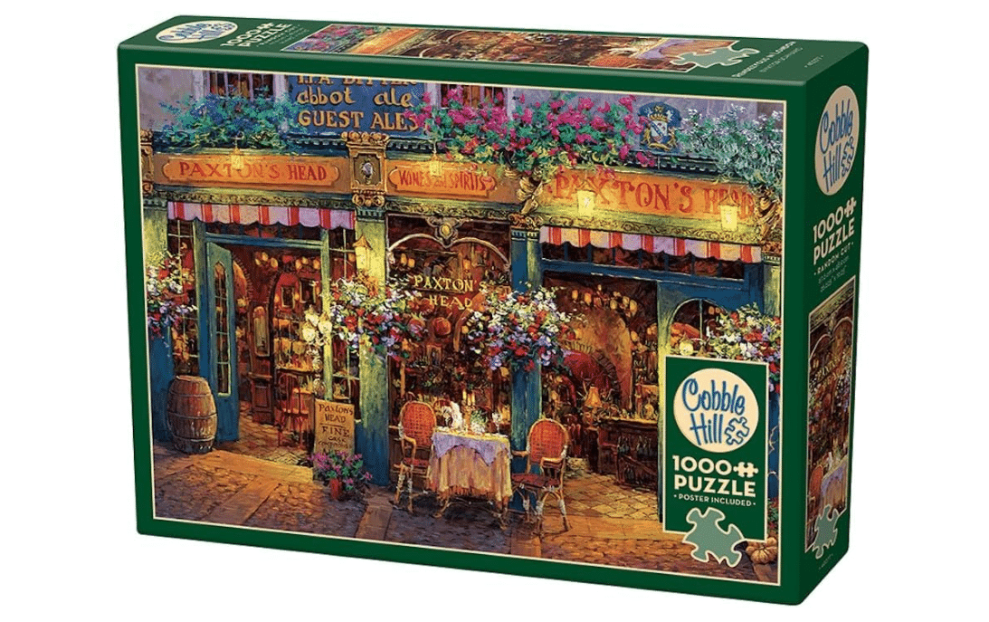 Sumérgete en una velada romántica con Rendezvous in London, un impresionante rompecabezas de 1000 piezas de Cobble Hill Puzzles, con ilustraciones de Victor Shvaiko. Con una cálida luz dorada que se derrama desde las ventanas de Paxton’s Head, vibrantes cestas de flores colgantes y una acogedora mesa de café para dos, esta escena de pub perfecta captura el corazón de una acogedora noche londinense.