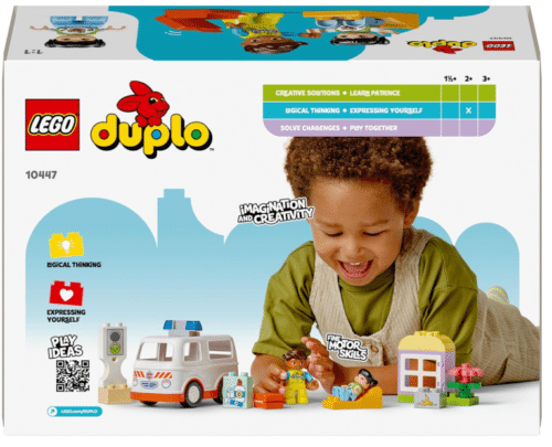 Los bebés protectores interpretan emocionantes escenas de rescate con el juguete Ambulancia y Conductor (10447) para niños y niñas en edad preescolar. Este set contiene una ambulancia conducible de juguete y 2 figuras LEGO® DUPLO® (un paramédico yuna chica) para jugar a imaginar con creatividad.