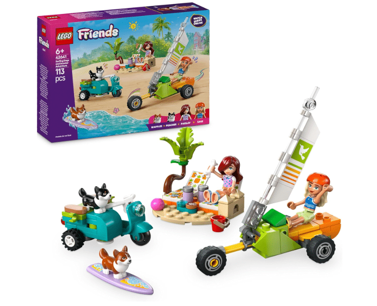 Este juguete incluye una tablita de surf, un escúter, un velero terrestre y tumbonas. Además, cuenta con 2 minipersonajes LEGO Friends y 2 figuras de corgis para disfrutar jugando con creatividad. El set es una fantástica ideade regalo para jóvenes entusiastas del juego imaginativo.