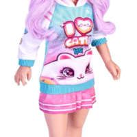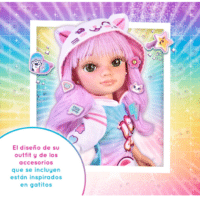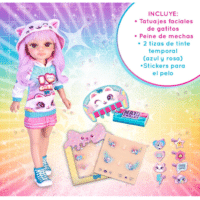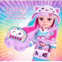 Diviértete creando peinados y maquillajes felinos con Nancy Catwaii! El diseño de su outfit y de los accesorios que se incluyen están inspirados en gatitos. Se incluye un peine diseñado para hacer mechas temporales en su pelo de dos colores, rosas y azules, así como unos stickers para el cabello.