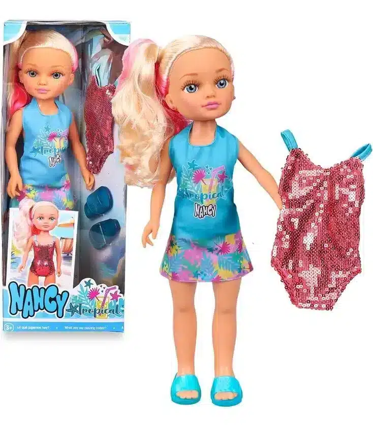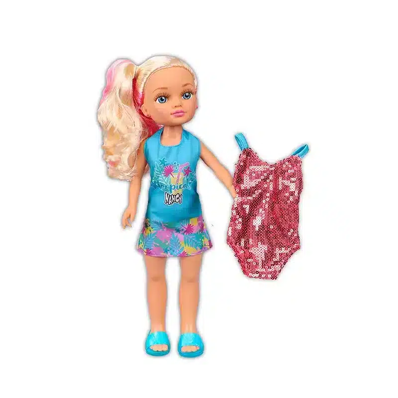 Nancy vestida con un conjunto super veraniego y con un trousseau de traje de baño de lentejuelas y sandalias.