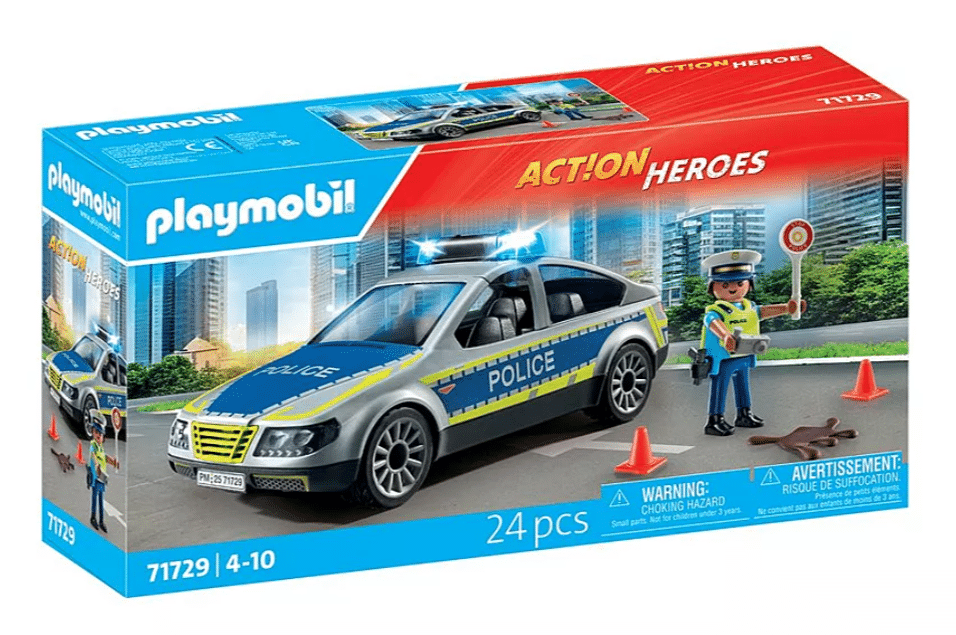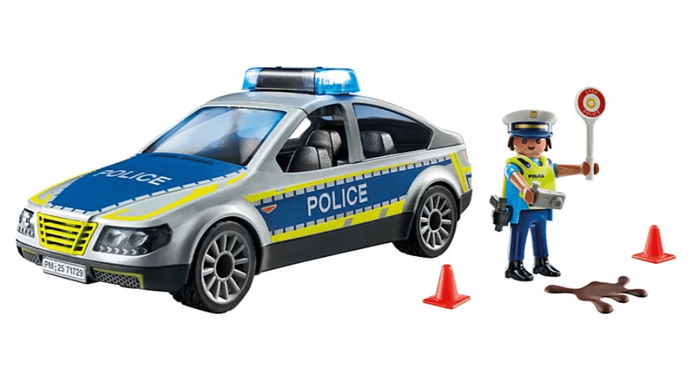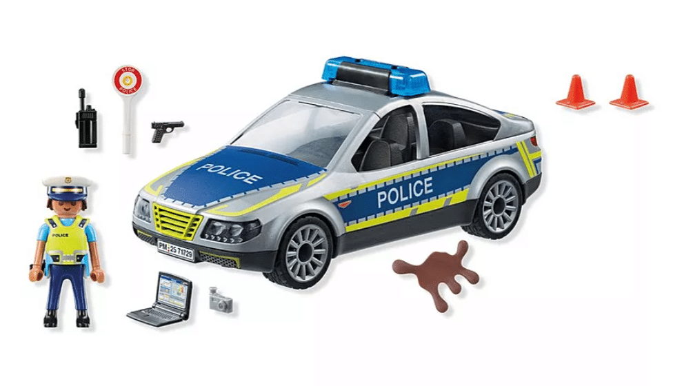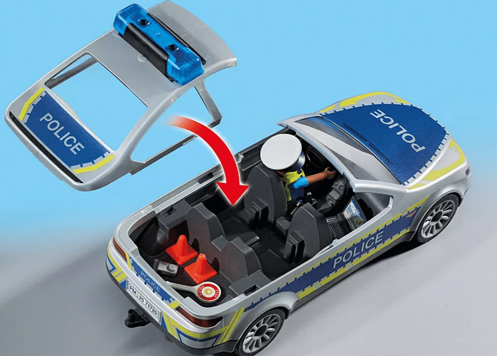 Genial coche de policía con luz azul intermitente y módulo de sonido (se necesitan 1,5V micro pilas, no incluidas en el artículo), techo desmontable y espacio para 4 figuras. Súbete y ayuda al policía a detener a los conductores que circulan con exceso de velocidad, asegura las escenas de los accidentes y recoge pruebas y datos policiales en el cuaderno.
