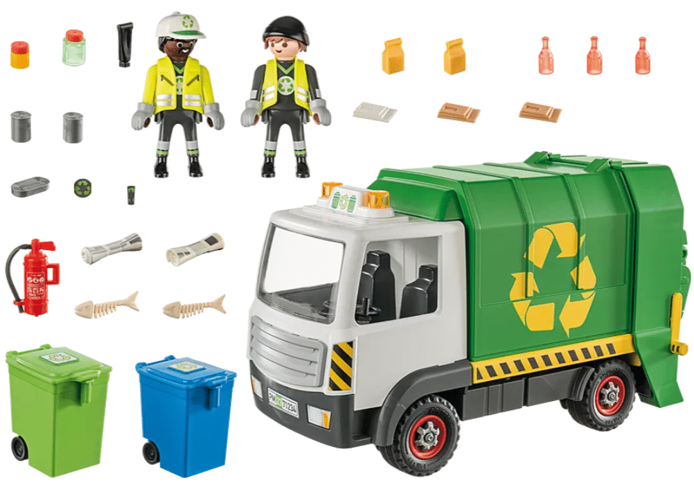 Dispone de sistema para recoger los contenedores incluidos, basura, 2 figuras playmobil y accesorios.