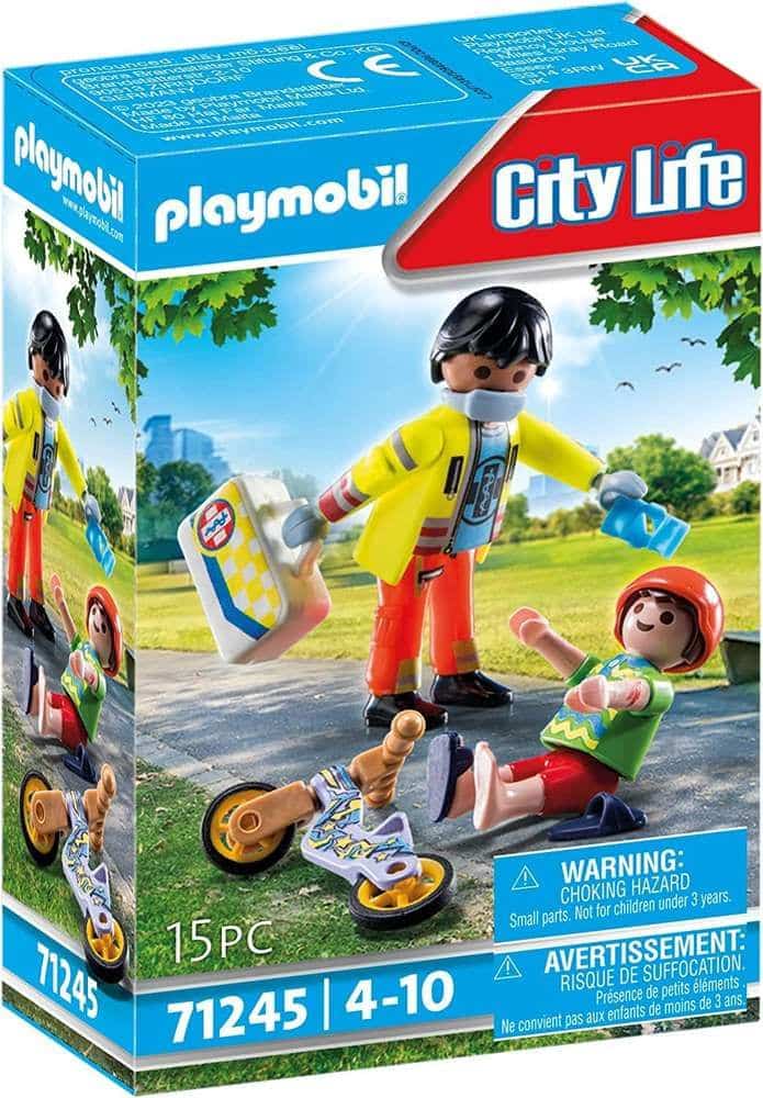 El cuidadoso paramédico siempre está dispuesto a ayudar. Para el tratamiento inicial de las heridas, tiene su botiquín con férulas y muchas vendas. Trata cuidadosamente la herida del niño herido y le aplica una férula en la pierna. El divertido esparadrapo de dinosaurio hace que el pequeño paciente vuelva a sonreír en poco tiempo. Un gran recuerdo o regalo para los pequeños paramédicos. El set de juguete a partir de 4 años incluye dos figuras PLAYMOBIL, un patinete, un botiquín, férulas de vendaje, un casco y otros extras. Con las escayolas incluidas se pueden curar las heridas. Las «heridas» en el brazo y la pierna de la figura del niño están hechas de pintura sensible al calor, que desaparecen al frotar y vuelven a ser visibles después de enfriarse. La máscara bucal, el casco y las zapatillas de baño son desmontables. La serie PLAYMOBIL City Life incluye modernos vehículos y personajes realistas con los que los niños pueden desarrollar importantes habilidades y sumergirse en emocionantes juegos de rol.