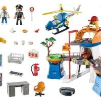Con efectos de luz y sonido integrados. Incluye tobogán de caída libre con control direccional, ascensor de manivela y pista de aterrizaje para el helicóptero de la policía. El centro de mando secreto en una de las pequeñas torres y la zona de juegos con estanque, árbol, columpio y escondite secreto ofrecen una experiencia de juego emocionante y divertida.