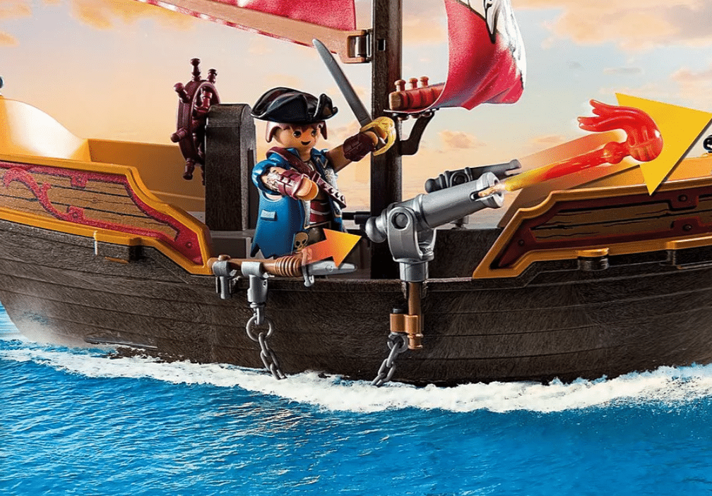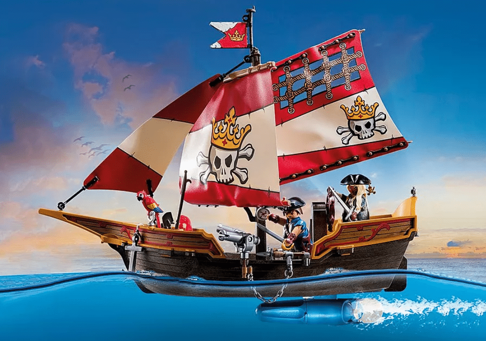 ¡Zarpa con el Barco Pirata de PLAYMOBIL y sumérgete en un mundo de aventuras! Este barco flotante cuenta con cañones giratorios, velas móviles y accesorios detallados, perfectos para piratas a partir de 4 años.