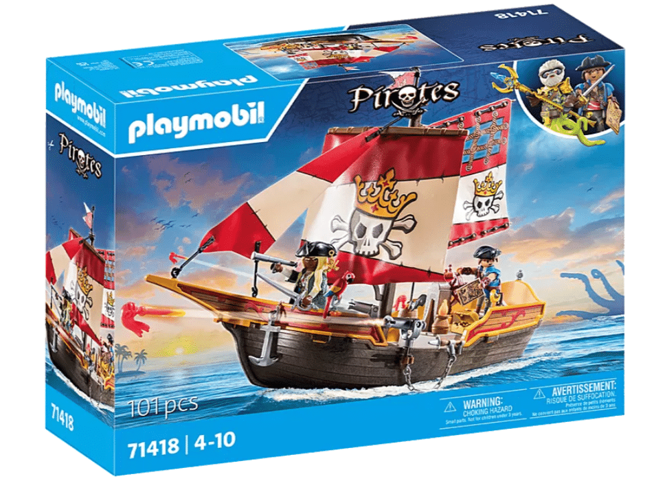Únete a la Reina Pirata y al Cazador de Manta Myles en su búsqueda de tesoros perdidos. Con espacio para varias figuras y un loro de compañía, este barco PLAYMOBIL garantiza horas de juego imaginativo.