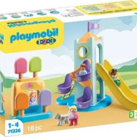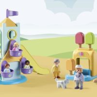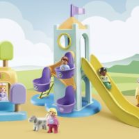 El Parque Infantil de Aventuras ofrece muchas divertidas opciones para explorar. La noria se pone en movimiento girando la manivela. Y hay una función doble oculta: cuando se coloca una figura en la plataforma, se mueve gradualmente hacia el tobogán hasta que se desliza solo. Comprender las relaciones causa-efecto promueve las habilidades cognitivas y el desarrollo de los niños y niñas. Combinar las figuras con el asiento correspondiente y jugar a clasificar los colores con los palos de helado proporciona un valor de juego adicional. Este tipo de juego creativo con figuras también entrena las habilidades motoras finas e inicia el primer juego de roles.