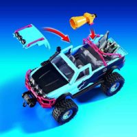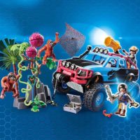 Camión con polea y cañón que dispara una red. El techo se puede quitar. Incluye figura de Rock Brock y Alex, protagonistas de la serie SUPER 4. Además, incluye dos orangutanes y vegetación.