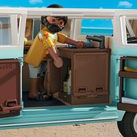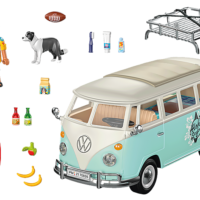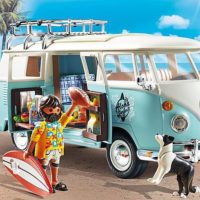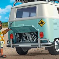 El set de juego incluye una figura PLAYMOBIL, un Border Collie, un T1 Camping Bus en Edición Especial surfera con techo desmontable, interior detallado, espacio de almacenamiento en las puertas laterales, una tabla de surf y muchos otros adorables extras.