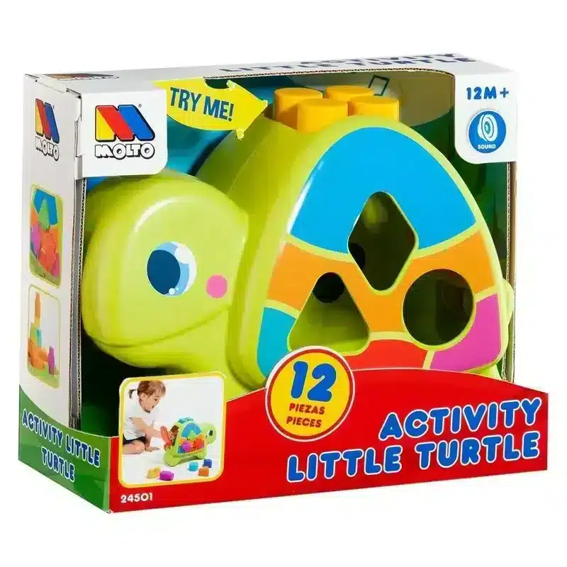 TORTUGA DE ACTIVIDAD MOLTO CON ACTIVIDADES Y SONIDOS PARA QUE TUS HIJOS DESARROLLEN LA IMAGINACIÓN Y LA COORDINACIÓN. INCLUYE 6 BLOQUES MOLTO Y 6 CLASIFICADORES DE FORMAS DIFERENTES CON LOS QUE SUS HIJOS PUEDEN CONSTRUIR, UNA VEZ QUE TERMINEN DE JUGAR PUEDEN GUARDAR LOS BLOQUES DENTRO DE ÉL. ESTE TIPO DE JUEGO BENEFICIA EL DESARROLLO MOTRIZ, COORDINACIÓN E IMAGINACIÓN DE LOS NIÑOS MIENTRAS SE DIVERTEN JUGANDO AL MISMO TIEMPO.